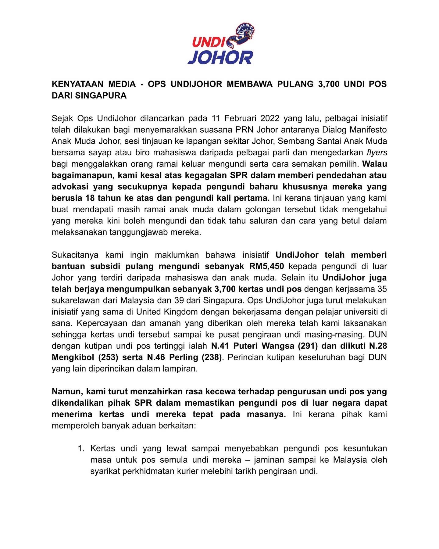 تويتر Undi Johor على تويتر Kenyataan Media Ops Undijohor Johor Membawa Pulang 3 700 Undi Pos Dari Singapura Sebanyak Rm5450 Bantuan Subsidi Pulang Mengundi Telah Diberi N 41 Puteri Wangsa Merupakan Jumlah Kutipan